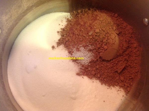 Cho kem tươi, đường và bột cacao vào nồi rồi khuấy đều. Đặt nồi lên bếp đun vừa lửa cho đến khi sữa nóng già thì tắt bếp, lưu ý là không đun sôi nhé.