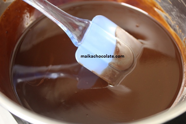Cho socola đen vào hỗn hợp nóng trên, khuấy đều cho socola tan chảy hoàn toàn. Sau đó, cho thêm sữa tươi vào và khuấy cho hỗn hợp đồng nhất rồi lọc qua rây cho mịn. Sau đó, để nguội hẳn.