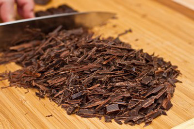 Bước 1: Để làm socola valentine, các bạn cần chuẩn bị một nồi nhỏ và một bát sứ sao cho khi đặt vào nồi có thể kín được miệng nồi để chúng ta đun cách thủy socola. Các bạn thái nhỏ socola đen ra nhé.