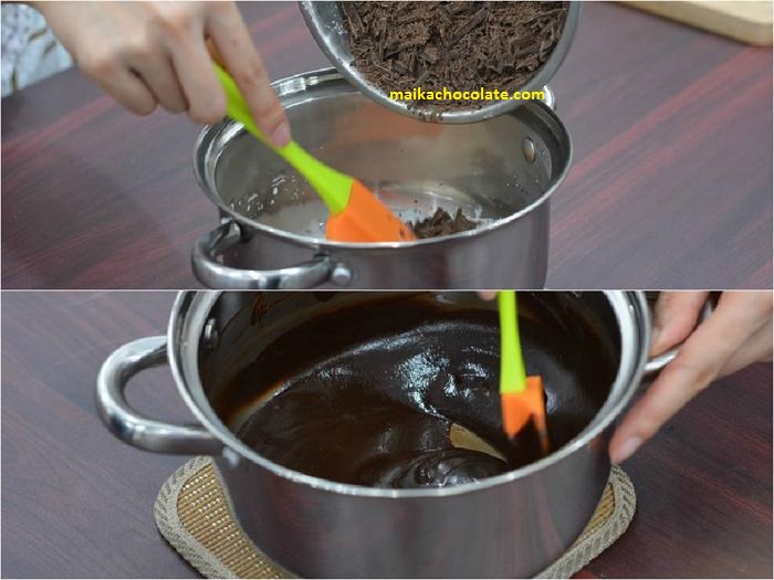 Cho socola vào kem tươi nóng, khuấy đều tay