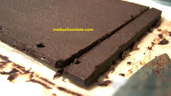 - Sau 1 tiếng, socola sẽ đông lại nhưng không bị cứng, các bạn dùng dao sạch để cắt socola thành từng miếng nhỏ nhé!